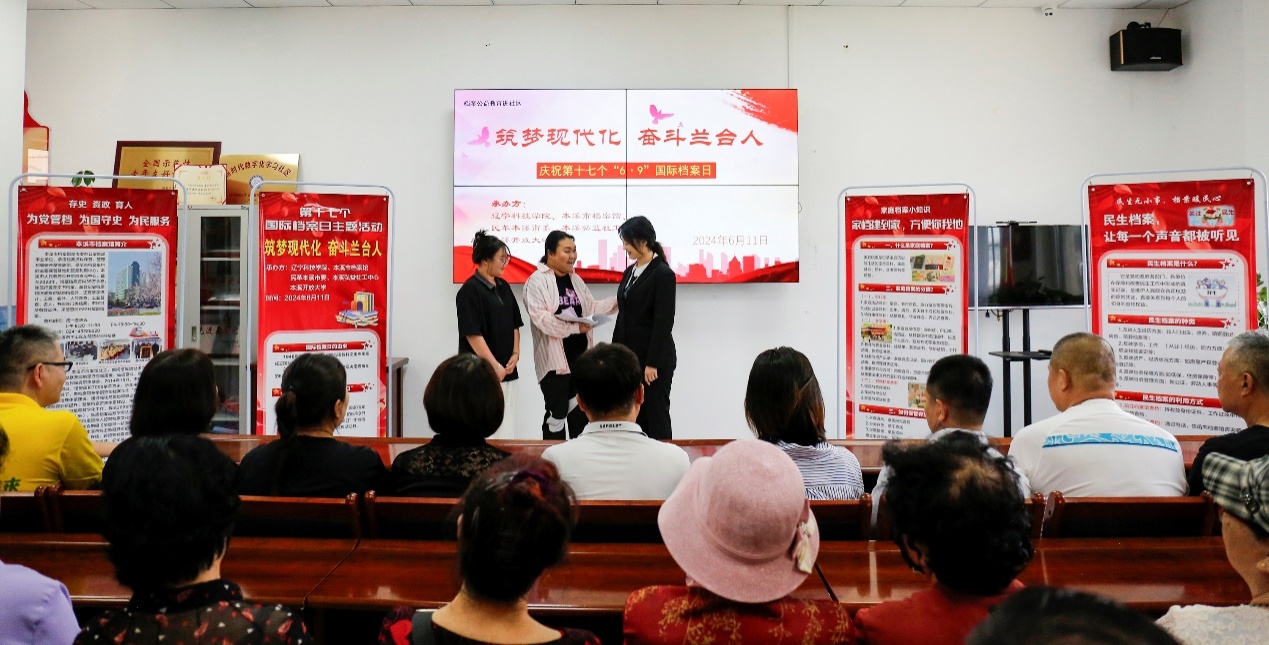 6月11日,为庆祝第十七个“6.9”国际档案日,提升档案事业的社会影响力,经济与管理学院联合本溪市档案馆、民革本溪市委、本溪弘益社工中心、本溪开放大学,在本溪市明山区民建社区,举办了一场主题为“筑梦现代化 奋斗兰台人”的档案公益教育活动。本溪市政协副主席李春,本溪市档案馆馆长韩晓东,我校经济与管理学院档案学专业师生,各参加单位代表、社区居民共计100余人参加活动。活动由经济与管理学院副院长许婷婷主持。
