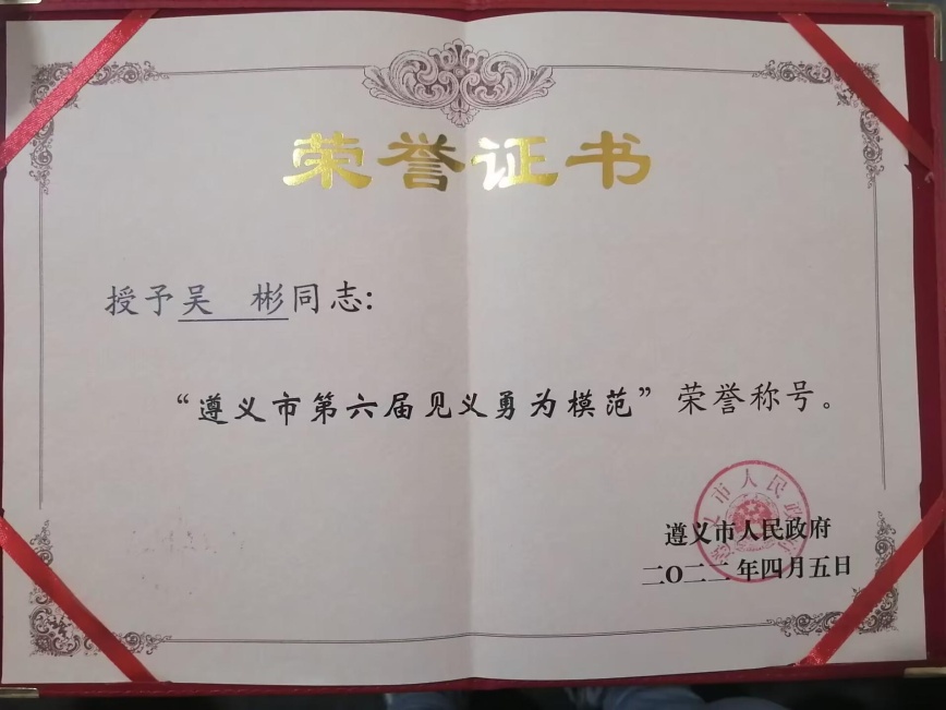 2022年4月5日,荣获贵州省遵义市人民政府“遵义市第六届见义勇为模范”荣誉称号