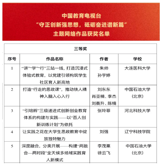 近日,中国教育电视台“守正创新强思想,砥砺奋进谱新篇”主题网络作品遴选结果公布,我校辅导员刘强的作品《让实践之花在大学生思政教育中绽放独特魅力》荣获典型案例类三等奖。