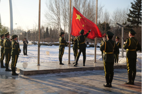 上午7时30分,升旗仪式正式开始,国旗护卫队员们步伐坚定有力,护送五星红旗入场。伴随着嘹亮激昂的国歌声,鲜艳的五星红旗冉冉升起,迎风飘扬。全体师生面向国旗,行注目礼,奏唱国歌。