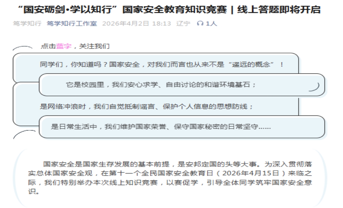 2026年4月15日是第11个全民国家安全教育日。为切实提升广大师生国家安全意识和素养,不断提高维护国家安全的能力,学校紧紧围绕“统筹发展和安全 护航‘十五五’新征程”活动主题,通过多种形式开展全民国家安全教育日宣传教育活动,筑牢校园安全防线。