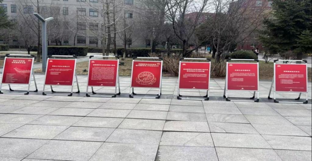 活动期间,学校通过线上线下联动方式,构建全方位宣传教育矩阵。充分利用校园官网、微信公众号推送答题竞赛题库、安全防护指南等内容;制作国家安全宣传标语横幅,悬挂在校园醒目位置;在校园广场摆放全民国家安全教育日主题宣传展板、展架,在教学楼、学生公寓张贴国家安全宣传海报,实现教育资源随时可学、随处可见,推动总体国家安全观深入人心。