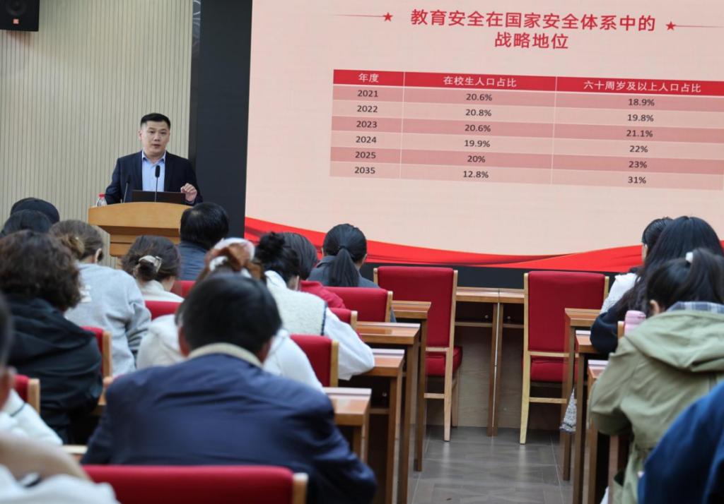 开展辅导员国家安全教育专题培训,安全保卫处副处长谢宗熹以《贯彻总体国家安全观筑牢校园安全主阵地》为题,围绕全民国家安全教育日的由来、认清当前国家安全形势、高校校园安全重点领域、辅导员队伍的使命任务、着力做好安全工作落实等内容进行讲授,为参训人员呈现了兼具理论深度与实践价值的授课内容,让在场师生深刻体会到维护国家安全是每一位公民的责任与义务。